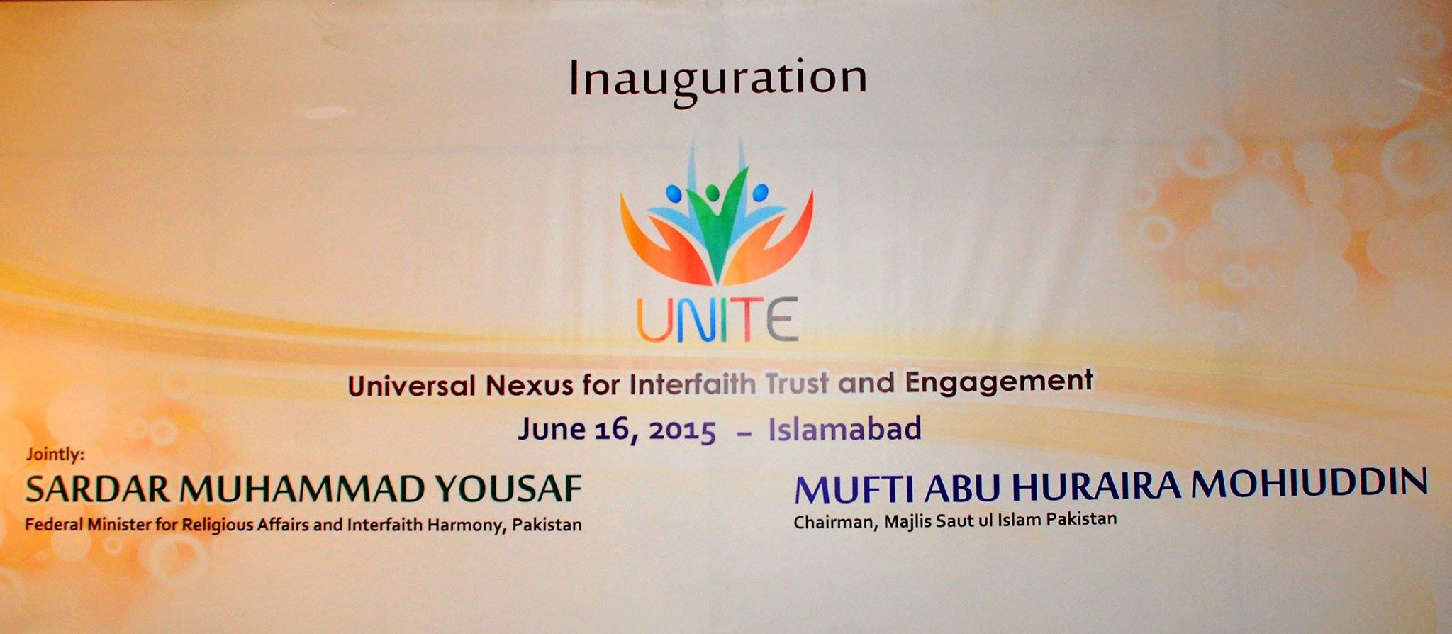 Inauguration ceremony of Universal Nexus for Interfaith Trust and Engagement (UNITE) organized by Federal Ministry of Interfaith Harmony on June 16, 2015. The ceremony was attended by Minister for Interfaith Harmony Sardar Mohammad Yousuf. UNITE Chairman Mufti Abu Huraira Mohiuddin said that it was because of the few so-called religious leaders that the image of clergy class has been portrayed negatively in the society. He said they have trained 600 religious scholars on peace, interfaith harmony and tolerance. Ms. Bashir said that there was shrinking space for people from different religions and urged for mutual respect to foster harmony. She demanded from the Federal Minister that we need those religious and political leaders who own us.